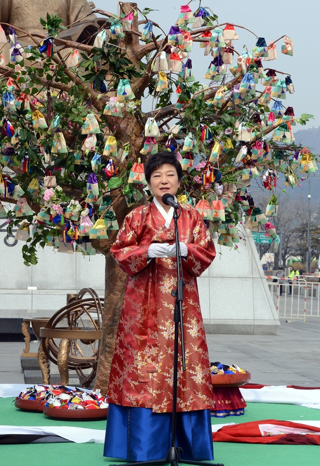 2013년 2월25일 박근혜 대통령이 취임 행사에서 ‘오복낭’이 주렁주렁 걸린 ‘희망의 나무’ 아래 서 있다. 박 대통령은 ‘비선 실세 최순실’ 사태에서 ‘무속 정치’를 했다는 의혹을 사고 있다. 일부 무속에서 오복낭은 ‘우주와 인간을 잇는다’는 뜻이고, 박 대통령이 입은 붉은 옷은 ‘마귀를 물리치는 강력한 벽사’란 의미를 지닌다. 사진공동취재단