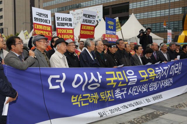 민주주의국민행동 등 60여 개 시민사회단체가 10월26일 서울 광화문 광장에서 “더 이상 국민을 모욕하지 마라”는 펼침막을 걸고 박근혜 대통령의 퇴진을 요구하고 있다. 류우종 기자