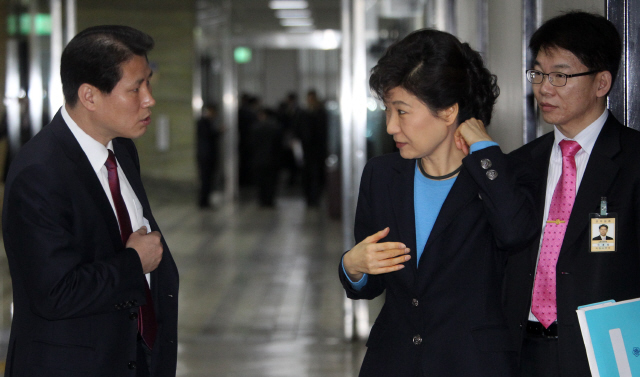 2011년 3월9일 당시 박근혜 한나라당 대표(가운데)와 ‘문고리 3인방’ 중 한 명인 안봉근 비서관(왼쪽)이 국회 기획재정위원회 회의장 앞에서 대화하고 있다. 연합뉴스