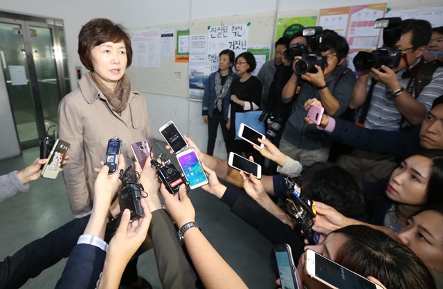 최경희 이화여대 총장이 10월17일 교내에서 열린 최순실의 딸 정유라 관련 특혜 의혹을 해명하는 교직원 간담회에 앞서 기자들의 질문에 답하고 있다. 한겨레 이정우 선임기자