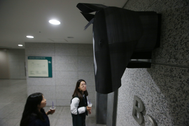 10월18일 서울 이화여대 종합과학관 엘리베이터 옆 벽면에 최순실의 딸 정유라 특혜입학 의혹을 풍자한 말 머리 모양의 조형물이 설치돼 있다. 한겨레 신소영 기자