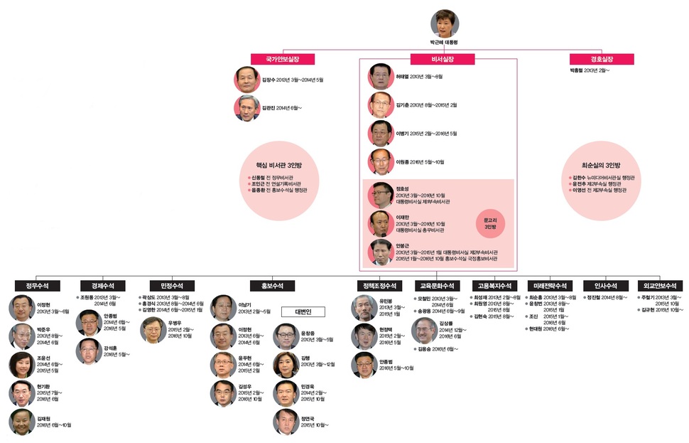 ‘최순실 게이트’로 청와대는 만신창이가 됐다. 게이트의 주역이자 배후인 박근혜 대통령은 열흘 새 두 차례나 사과했지만 국민의 시선은 싸늘하다. 3년8개월, 청와대 참모들이 박 대통령을 막을 시간은 충분했다. 결정적 기회도 있었다. 2014년 ‘정윤회 게이트’가 터졌을 때 ‘악순환의 고리’를 끊을 수도 있었다. 그러나 최순실이 수시로 청와대를 드나들면서 국정을 주무르는 동안 4명의 대통령 비서실장을 비롯한 청와대 비서진은 침묵했다.