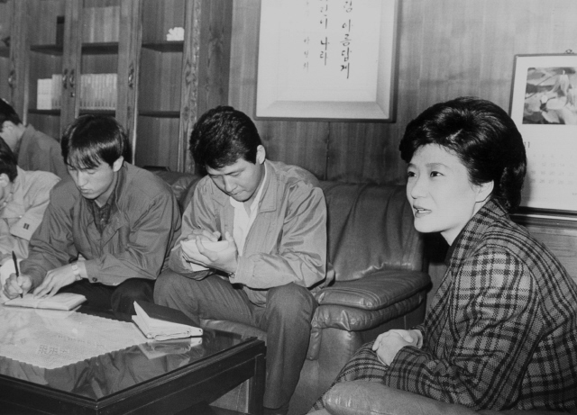 1990년 11월7일 박근혜(맨 오른쪽) 육영재단 당시 이사장이 돌연 사퇴했다. 박 전 이사장 등 박정희 대통령의 자녀들은 부모에게 물려받은 현물 자산뿐 아니라 정치·사회적 자산을 두고 끊임없이 논란을 빚어왔다. 연합뉴스