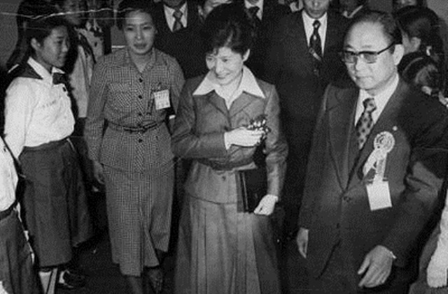 박근혜 대통령(오른쪽 두 번째·당시 영애)이 1977년 3월16일 최태민 구국봉사단 총재(맨 오른쪽)의 안내로 걸스카우트 대원들을 격려하고 있다. 연합뉴스
