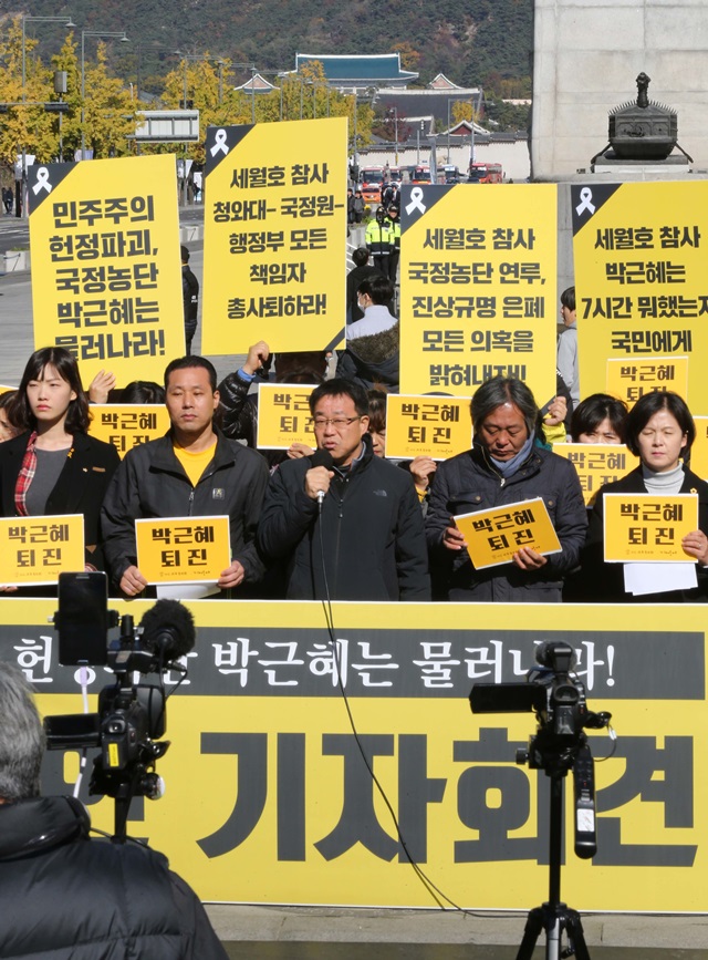 세월호 유가족이 11월1일 서울 광화문광장에서 시국선언 기자회견을 열어 “국정 농단의 주범 박근혜는 당장 물러나라”고 촉구했다. 한겨레 박종식 기자