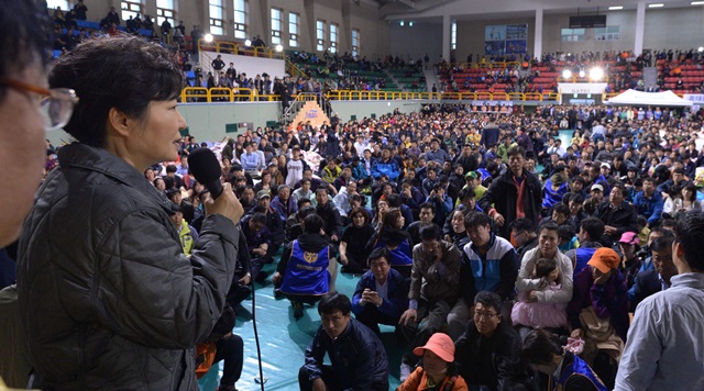 세월호 참사 이튿날인 2014년 4월17일 박근혜 대통령이 전남 진도체육관에서 실종자 가족들을 위로하고 있다. 이날도 박 대통령은 최순실의 딸 정유라를 챙긴 것으로 드러났다. 청와대사진기자단