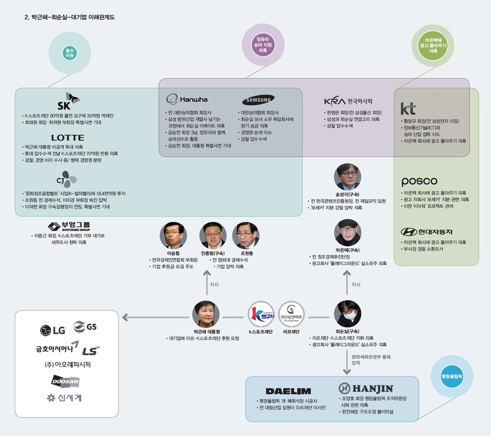 두 재단에 수십억∼수백억원을 낸 기업들은 이해관계가 저마다 달랐다. 각 기업들이 박근혜 정부에 어떤 특혜 또는 대가를 원했는지, 최순실·차은택씨 등과 직간접적으로 어떤 관계를 맺고 있었는지 한눈에 보기 쉽도록 관계도를 그려봤다.