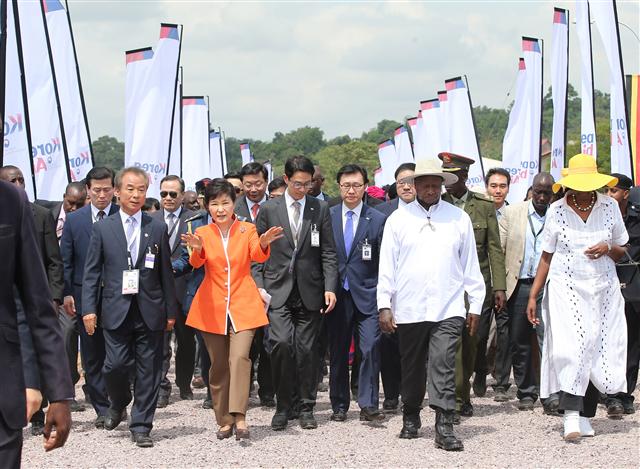 지난 5월30일 우간다를 국빈 방문한 박근혜 대통령이 우간다 음피지 농업지도자연수원 개원식에 참석한 뒤 요웨리 무세베니 우간다 대통령 내외 등과 함께 코리아에이드 사업 현장으로 이동하고 있다. 연합뉴스
