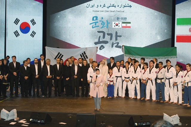 지난 5월2일 이란을 국빈 방문한 박근혜 대통령이 테헤란 시내 밀라드타워에서 ‘한-이란 문화공감’ 공연을 관람한 뒤 인사말을 하고 있다. 박근혜 대통령 오른쪽 뒤로 K스포츠재단에 속한 태권도팀 ‘K스피릿’ 선수들이 서 있다. 청와대사진기자단