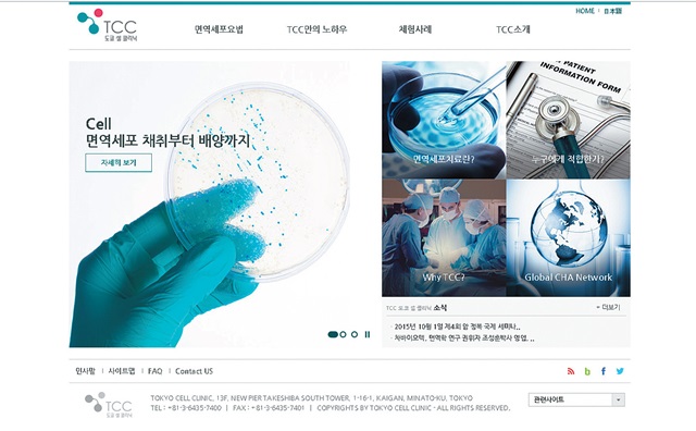 ‘도쿄셀클리닉’은 차병원그룹 계열의 차바이오텍이 일본 현지에서 운영하는 세포치료 전문병원이다. 김기춘 전 대통령 비서실장이 이곳에서 면역세포 치료를 했다가 ‘편법·할인 원정 시술’ 논란을 불렀다. 도쿄셀클리닉 누리집 갈무리