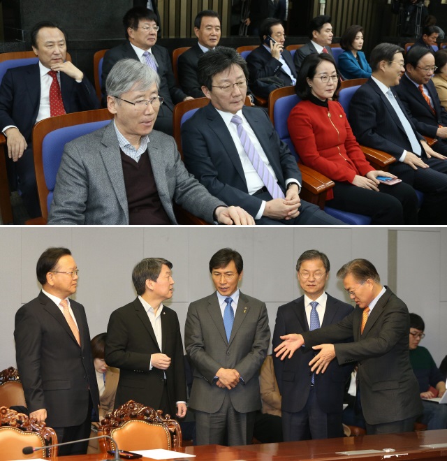 12월2일 국회에서 열린 새누리당 의원총회에서 ‘비박계’인 유승민, 나경원, 김세연 의원 등이 정진석 원내대표의 발언을 듣고 있다. 비박계는 박근혜 대통령 ‘탄핵’ 대신 ‘4월 퇴진’안을 받아들였다(위쪽). 문재인·안철수·박원순·안희정 등 야권 대선 주자들이 11월20일 국회에서 ‘비상 시국회의’를 열어 이야기를 나누고 있다(아래쪽). 한겨레 이정우 선임기자, 한겨레 강창광 기자