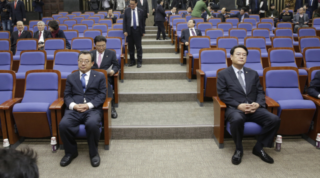 새누리당은 탄핵을 앞두고 찬성하는 비박계와 반대하는 친박계로 갈려 내홍을 겪었다. 12월8일 이정현 대표(왼쪽)와 정진석 원내대표가 의원총회를 앞두고 굳은 표정으로 앉아 있다.