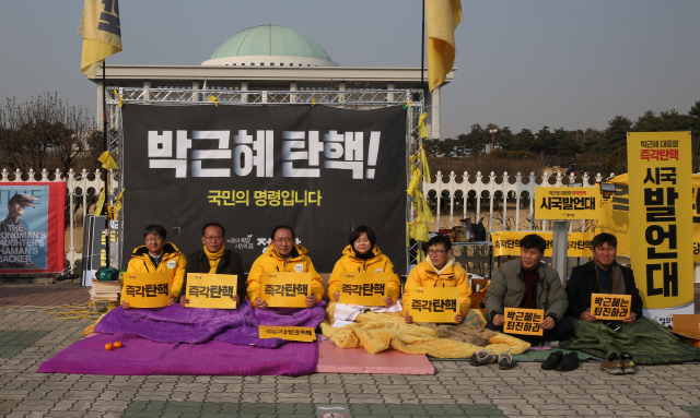 정의당은 국회 정문 앞에서 ‘풍찬노숙 끝장농성’을 벌였다. 12월7일 정의당 노회찬 원내대표(왼쪽 세 번째)와 의원, 당직자들이 ‘즉각 탄핵’ 구호가 적힌 팻말을 들고 있다.