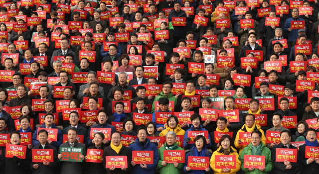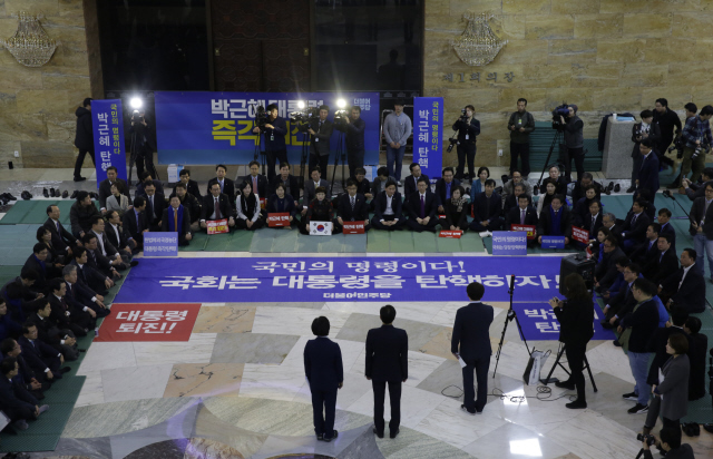 더불어민주당·국민의당·정의당 야 3당은 탄핵 과정에서 긴밀하게 공조했다. 12월 7일 야 3당 의원과 당직자들이 국회 본청 앞 계단에서 박근혜 대통령 탄핵을 위한 결의대회를 열고 있다.