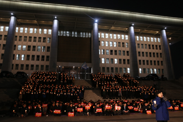 추미애 대표를 비롯한 더불어민주당 의원, 당직자들이 12월5일 저녁 서울 여의도 국회의사당 계단에서 촛불로 ‘탄핵’이란 글자를 만들어 박근혜 대통령의 즉각 퇴진을 요구하고 있다.