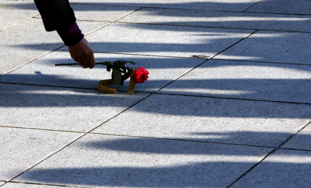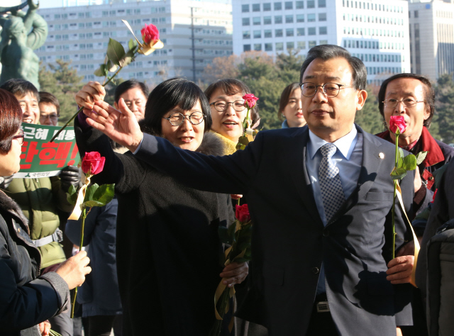 12월9일 한 시민이 서울 여의도 국회 본청 앞에 떨어진 장미꽃을 줍고 있다. 이날 참여연대와 환경운동연합 등 시민단체 회원들은 박근혜 대통령 탄핵소추안 가결에 동참해달라며 의원들에게 장미꽃을 나눠줬다.