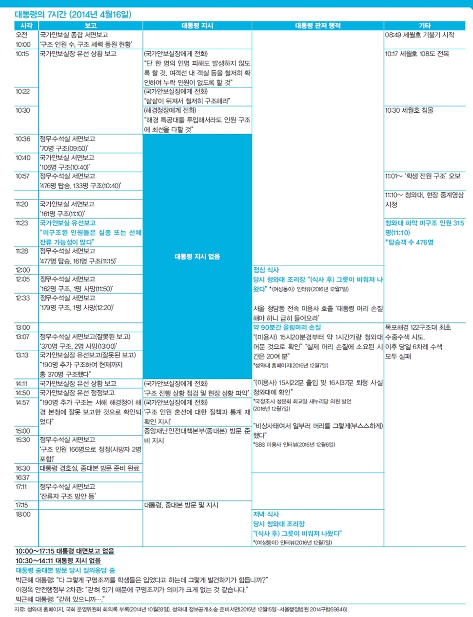 최순실 국정 농단 사건이 드러나면서 ‘세월호 7시간’은 국정 왜곡·공백의 극단적 상징이 됐다. 탄핵소추 안에도 포함됐다. 사흘간의 국정조사에선 청와대가 ‘세월호 7시간’에 대해 내놓은 그간의 해명이 ‘총체적 거짓말’이라는 의심을 살 만한 증언들이 나왔다.