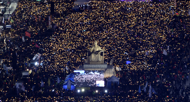 12월10일 7차 촛불시위에 참가한 시민들이 과거 집회 개최가 금지됐던 서울 광화문 세종대왕 동상을 둘러싸고 촛불을 흔들고 있다. 사진공동취재단