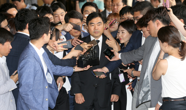 2016년 7월14일 넥슨의 비상장 주식을 뇌물로 받았다는 의혹 등을 받는 진경준 전 검사장이 피의자 신분으로 검찰에 출석하고 있다. 한겨레 김정효 기자