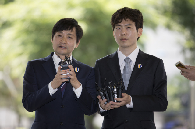 영화감독 김조광수씨(왼쪽)와 레인보우팩토리 대표 김승환씨가 2015년 7월6일 서울 마포구 서울서부지방법원에서 열리는 동성결혼 소송 첫 심문에 참석하기 위해 법정으로 향하던 중 기자들의 질문에 답변하고 있다. 한겨레 김성광 기자