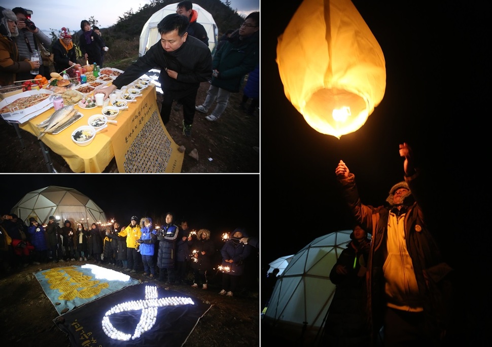 2016년 마지막 날과 새해 첫날 전남 진도 동거차도에서 세월호 유가족들이 마련한 해맞이 행사. 사고 미수습자 9명을 위한 차례상이 차려졌고(왼쪽 위), 이들을 위한 다짐과 추모의 시간이 마련됐으며(왼쪽 아래), 동거차도 하늘로 풍등을 띄워올렸다.