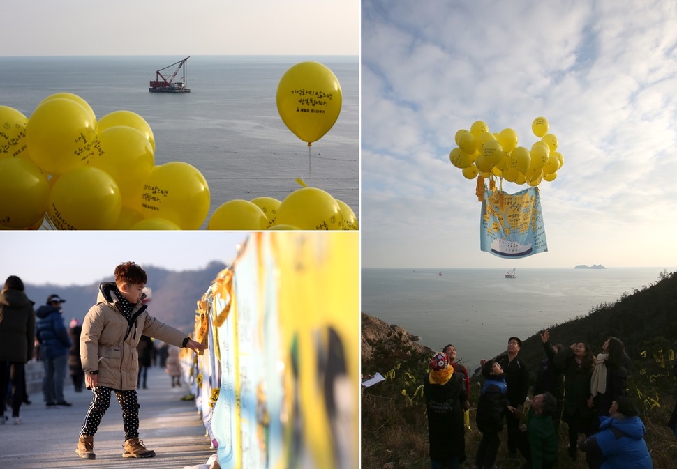 승현 아빠와 정수 아빠는 다른 피해 유가족 및 시민 40여 명과 새해 첫 새벽, 미수습자 9명을 위한 차례상을 산마루에 차렸다. 떡국 아홉 그릇에 과일, 떡, 생선, 치킨, 피자…. “나를 잊으셨나요?” “기억하지 않으면 반복됩니다” 문구를 적은 노란 풍선들이 섬 하늘로 날았다. 고깃배를 얻어 탄 가족들은 참사 해역으로 다가가 국화를 던졌다. 이들의 새해 소망은 단 하나. “조속한 세월호 인양, 그리고 진상 규명.”