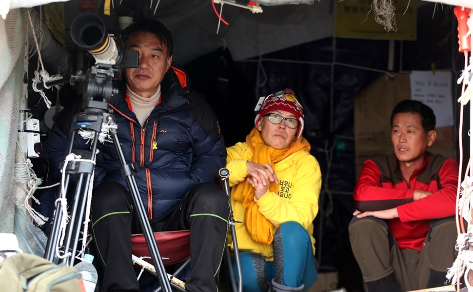 새해 첫날 동거차도 산마루 감시초소에서 망원카메라로 인양작업을 감시하는 유가족들.
