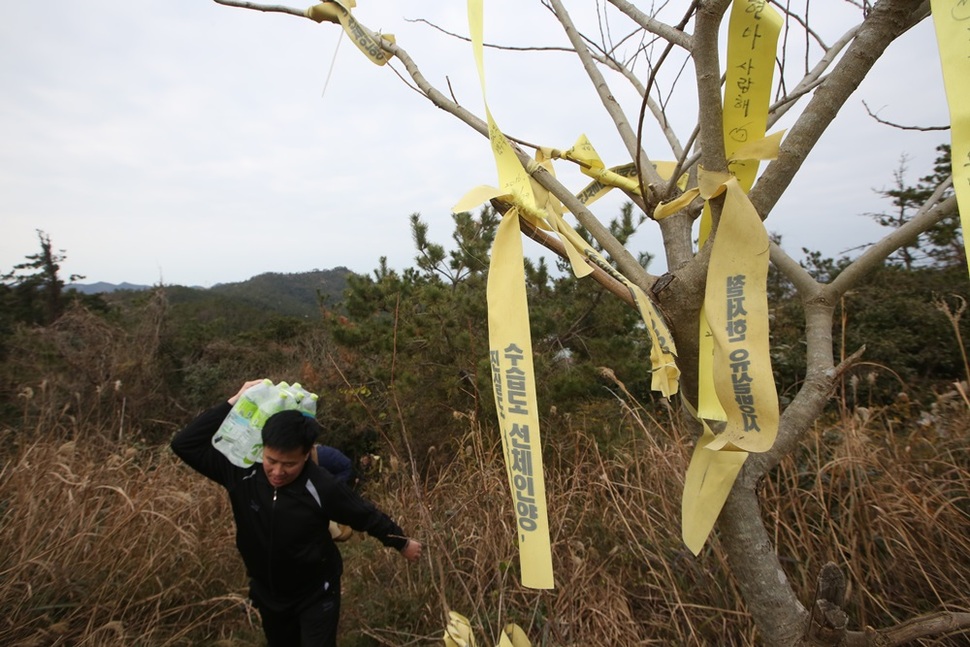 세월호 참사로 아들 정수를 잃은 최태신씨가 산마루 감시초소로 짐을 지고 오르고 있다.