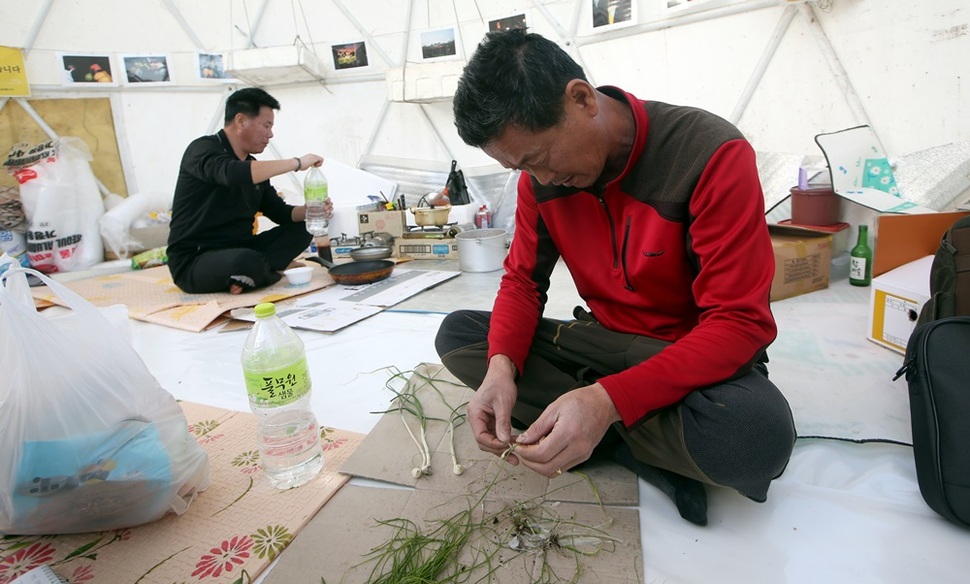 동거차도 천막 숙소에서 저녁밥을 준비하는 정수 아빠(왼쪽)와 승현 아빠.