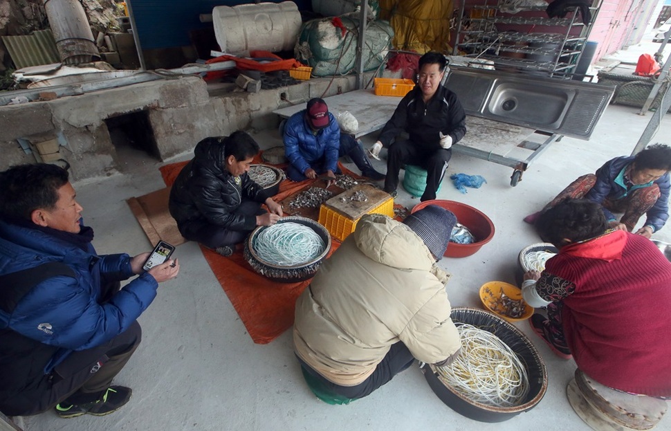 1월4일 오전 승현 아빠(맨 왼쪽)와 정수 아빠(왼쪽 네 번째)가 주민 이옥영씨의 주낙 채비를 돕고 있다.
