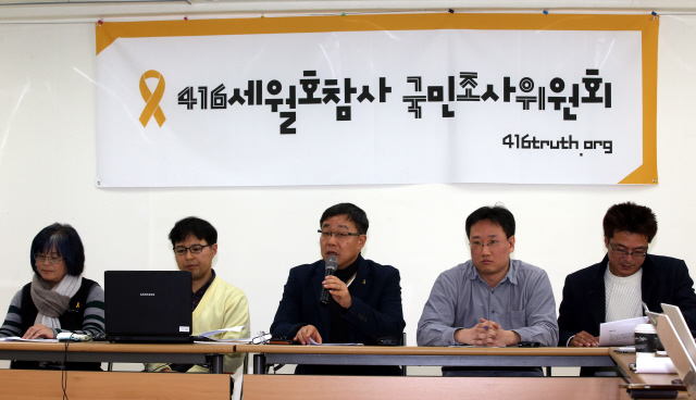 1월4일 서울 서교동 한국YMCA전국연맹 5층 회의실에서 열린 ‘4·16세월호참사 국민조사위원회’ 창립 및 활동계획 발표 기자간담회 중 유경근 4·16가족협의회 집행위원장(가운데)이 발언하고 있다. 한겨레 김태형 기자