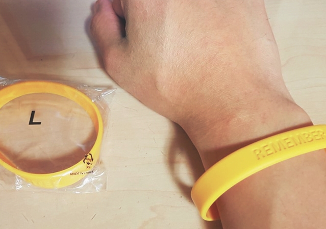 세월호 진실 규명은 이제 시작이다. 함께하는 사람이 많다. 이규종씨의 ‘세월호 노란 팔찌 ’. 이규종 제공