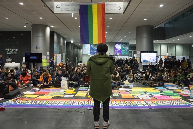 ‘성소수자차별반대 무지개행동’이 2014년 12월10일 서울시청에서 농성하는 모습. 그들은 박원순 서울시장에게 “동성애를 지지하지 않는다”는 발언에 대해 사과하고 면담에 응하라고 요구했다. 박승화 기자