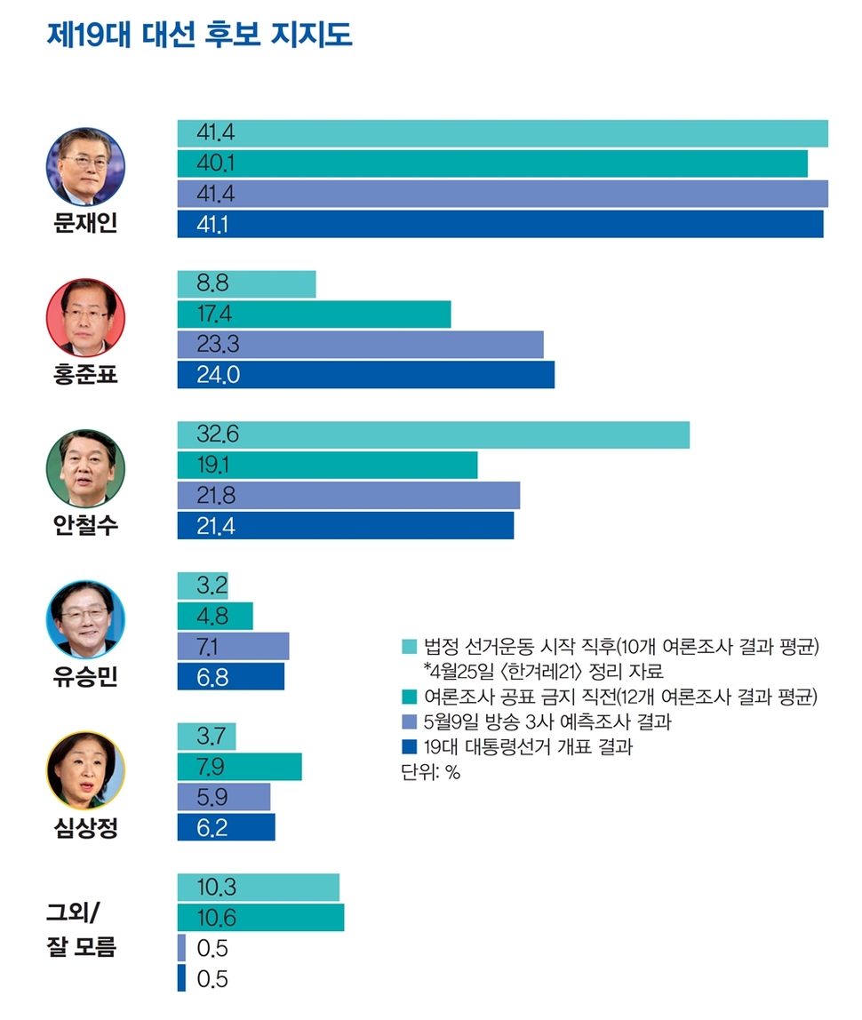 일부 성과도 있었습니다. ‘이전과 다른 TV토론 방식이 필요하다’(3월15일). ‘대통령은 적어도 1년에 한두 차례 서울 광화문에 나와 국정 과제를 놓고 시민과 토론해야 한다’(4월19일). 그 후 TV토론 방식이 바뀌었습니다. 특히 시민원탁회의 제안은 문재인 대통령이 5월2일 마지막 TV토론 자리와 5월8일 마지막 유세, 대통령 취임선서 등에서 약속했습니다. <한겨레21>이 여론 분석을 여론조사 분석으로 묶어두지 않았기 때문에 여러 정책과 대안까지 제안할 수 있었습니다. 문재인 대통령 당선과 득표율(41.4%) 예측은 맞았지만 후보별 격차와 순위는 예측하지 못하는 실수도 있었습니다(4월25일).