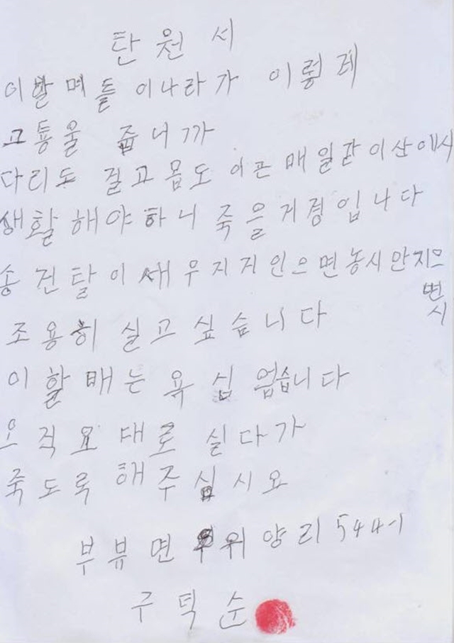“붕새야 붕새야 니는 저리 우는데 이 바보 같은 늙은이는 왜 바보가 됐노. 우리 엄마 날 글 가르쳐줄 때 (글공부를) 했으면…. 다른 사람은 청와대 못 들어가도 너는 짐승이라서 날아가서, 글 적은 거 날아가면 박근혜는 못 보더라도 누가 때려 접은 거 펴봤으면 내 심중을 알겠나.”(위양마을 주민·82)