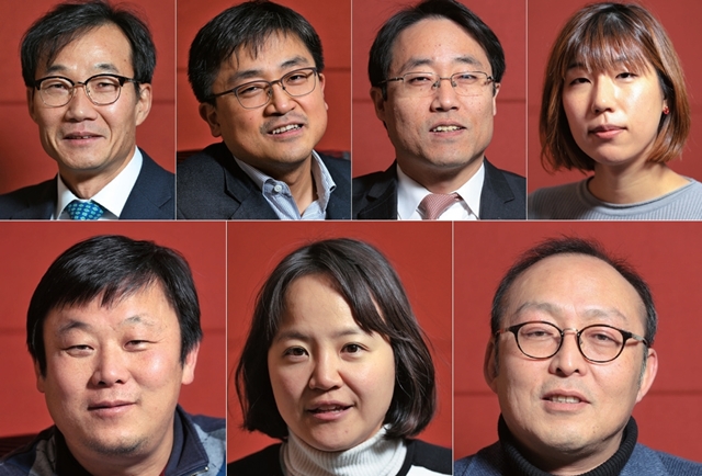 10회를 맞는 <한겨레21> ‘올해의 판결’ 심사에는 총 7명의 심사위원이 참여했다. 왼쪽부터 심사위원장인 노희범 변호사, 김태욱 변호사, 김한규 변호사, 박한희 변호사, 안진걸 참여연대 사무처장, 오지원 변호사, 이석배 교수.