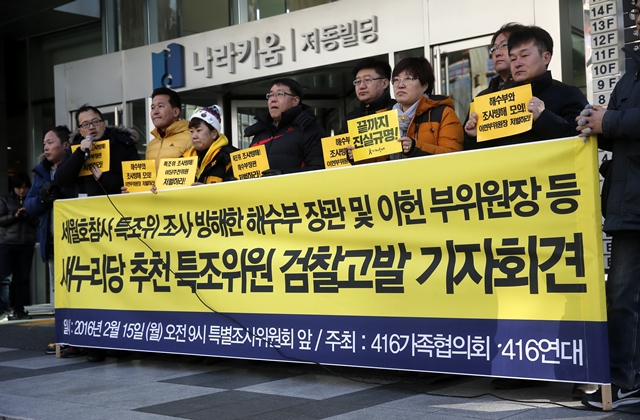 세월호 유가족들이 2016년 2월15일 세월호 특조위활동을 방해한 새누리당 추천 이헌 특조위 부위원장(대한법률구조공단이사장) 등을 검찰에 고발하는 기자회견을 하고 있다. 김명진 기자