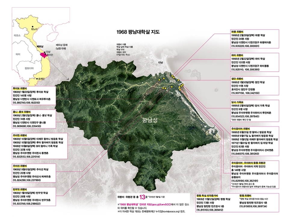표지이야기 “그 기억은요, 조금도 사그라들지 않아요” 참조). 꽝남성 곳곳에 있는 위령비들은 한국군이 베트남에서 저지른 민간인 학살의 전체 모습을 설명하기엔 여전히 불충분한 증거다. 위령비에는 건립 시점(보통 1990년대 이후)에 신원이 명확히 확인된 희생자 이름만 기록돼 있다. 가족이 끝내 나타나지 않았거나 오래돼 주검을 식별할 수 없었거나, 목격자·생존자가 없는 죽음들은 그대로 묻혔을 것이다. ‘1968 꽝남대학살 지도’가 끝내 미완의 지도일 수밖에 없는 이유다.