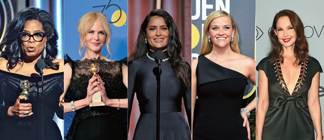 지난 1월7일 열린 제75회 골든글로브는 #미투 캠페인의 절정이었다. 왼쪽부터 오프라 윈프리, 니콜 키드먼, 살마 하이에크, 리즈 위더스푼, 애슐리 저드. 연합뉴스/ 연합뉴스/ 연합뉴스/ 연합뉴스/ 연합뉴스