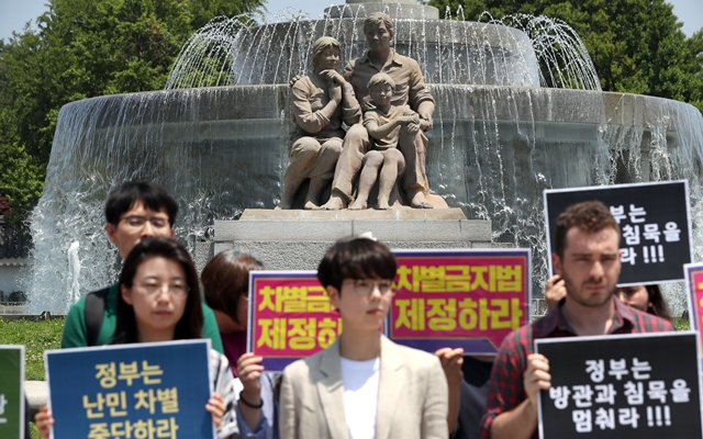 난민인권단체들이 6월20일 오후 청와대 분수대 앞에서 난민 혐오와 차별에 반대하며 생존권 보장을 요구하는 집회를 하고 있다. 정용일 기자