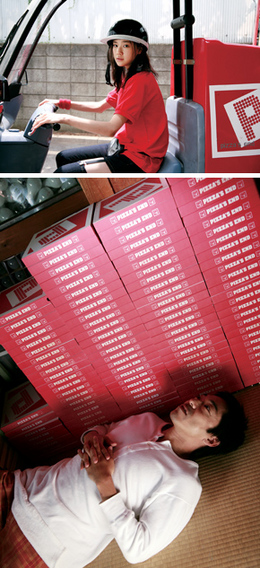 봉준호 감독의 <흔들리는 도쿄>에서 피자 배달원 소녀(위)를 만난 히키코모리 남자(아래)는 사랑을 느끼게 된다.