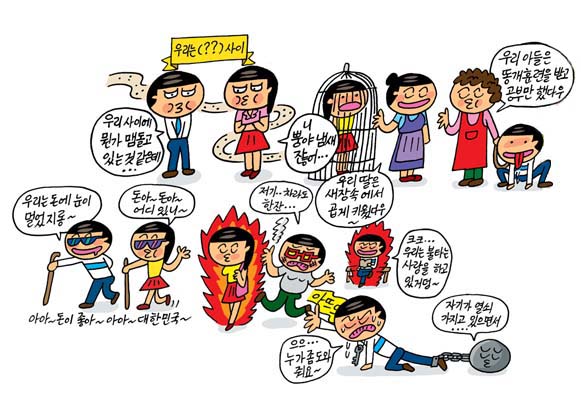 험악하게 내지른 뒤 차분한 논리로 달래고는 다시 익살을 내질러, 웃지 않을 도리 없는 ‘김어준식 삼단논법’을 완성하는 게 그 특유의 화법이다. 가령 이런 식의 재치. “가장 효과적 이별. 그녀와 친구들 앞에서 친구를 칭찬하라. 그녀와 비교하며. 외모만. 그리고 뒤도 돌아보지 말고 떠나라. 잡혀 죽는 수 있다.” 또는 이런 식의 눙치는 솜씨. “그녀 집안이 엄청난 부자다. 그리고 당신은 독립적인 인격체가 되는 것 따위는 관심 없고 돈이 너무 중요하다. 그런데 그녀와 결혼하면 바로 그 돈을 얻을 수가 있다. 그러면 뭐, 꾹, 참아야지.” 밑줄 그으라 외치는 잠언 여럿 정현종 시인의 시를 빌려 말하면, 김씨는 ‘쓰러지는 법이 없는… 가볍게 떠오를 준비가 되어 있는… 탄력의 나라의 왕자처럼’ 느껴진다. 하지만 김씨는 탄력 못지않게 탄탄한 논리를 내장하고 있다. 실제 그는 꽃병에 꽃을 꽂듯 책 곳곳에, 밑줄 긋고 외라고 유혹하는 듯 잠언 여럿을 새겨넣었다. “기대를 저버리는 연습 없이는, 평생을, 남의 기대를 위해 자신의 인생을 쓰고 만다”거나 “‘누군가의 자식’이 아니라 ‘누군가’가 되어야 한다”는 것은 제 삶을 스스로 거머쥐라는 뜻이다. 또 “푸념으로 바꿀 수 있는 건 아무것도 없”으므로 “선택은 언제나 선택하지 않은 것을 비용으로 한다”며 선택과 책임은 짝패처럼 떼려야 뗄 수 없는 것임을 강조한다. “(진짜) 문제는 (자신이) 이기적이냐 아니냐가 아니라 과연 어디서 그 한계를 긋느냐 하는 거”라거나 “딱 반이 항상 가장 공평한 건 아니라는 거. 사실 모든 인간관계가 다 그렇다”는 문장에선 사람에 대한 깊은 이해가 또렷하다. 예의 전복적 사고 또한 드물지 않으니 “나이 들어 가장 비참할 땐 결정이 잘못됐다는 걸 알았을 때가 아니라 그때 아무런 결정도 내리지 못했던 걸 깨달았을 때다” “사랑이란 모든 걸 내 뜻대로 할 수 있어 하는 게 아니라, 어떤 것도 내 뜻대로 되지 않건만 사랑하지 않을 도리가 없어서, 하는 거다” “애들은 보고 싶은 것만 보고, 어른은 보고 싶지 않은 것까지 보는 거다”라고 단정한다. 그래도 그것이 섣부른 생각으로 읽히지 않는 게 김씨 문장의 매력일 것이다. <딴지일보> 10년의 열쇳말은 아마도 ‘엽기’일 것이다. 그것은 김씨가 2000년 <딴지일보 졸라 스페셜>에서 말한바 “발상의 전환, 주류의 전복, 왜곡된 상식의 회복, 발랄한 일탈”을 뜻한다. ‘명랑사회’ 구현을 위해 행복해지기, 그 해답의 처음은 자기 반성이요 끝은 자존감이라는 보편적 상식에 이 책은 기대고 있다. 그것은 영국의 소설가 아이리스 머독이 남긴 문장을 불러낸다. “나의 행복은 슬픈 얼굴을 하고 있다. 너무도 슬퍼서, 다년간 나는 그것을 불행이라 여기고 내몰았던 것이다.” 전진식 기자 한겨레 편집2팀 seek16@hani.co.kr