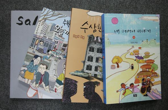 어쨌든 불황이 김수박씨를 비켜가지만은 않았다. 2008년 초 계약한 <오늘까지만 사랑해>는 2008년 말 책으로 ‘물성화’됐으나, 2008년을 건너오는 중에 시작된 프로젝트 몇 개는 끝까지 가지 못했다. 메이저 출판사의 어린이 교양만화, 생태만화 등 두 편의 만화 작업이 중단됐다. 인터넷과 인연이 깊은 또 다른 만화도 출간되었다. 창비뉴스레터와 함께 배달되던 오영진씨의 <수상한 연립주택>(창비 펴냄). 서울 은평구 황금동 연립주택에는 반지하에서 옥탑방까지 여섯 가족 13명(+개 한 마리+황금비둘기 여러 마리)이 산다. 연립주택은 대한민국의 축소판이다. 계급의 최하층에서 최상층까지의 사람들은 사랑과 불륜, 모략과 음모로 엇갈린다. 호황도 불황이던 작가들의 호황 성형외과를 운영하는 김팔봉은 주식에 손을 대고 내려앉은 뒤 연립주택을 사서 이사왔다. 창문이 좁아 들어가지 않는 화려한 소파는 집 앞에 놓여 사람들의 쉼터가 된다. 최상위층 옥탑의 고시생 한국판은 법으로 주택 주민들의 ‘선지자’ 행세를 한다. 선지자는 금세 김팔봉의 감언이설에 넘어간다. 살던 집이 재개발 지역에 포함되면서 김팔봉은 ‘10년 만의 재기’를 노리지만 희귀종 ‘황금비둘기’ 때문에 꿈이 좌절될 위기에 놓인다. 새만화책에서는 의미 있는 첫 결실을 냈다. 김은성씨의 <내 어머니 이야기 1부>는 무크지로 발간되는 <새만화책>에 연재된 작품으로는 처음 책으로 엮였다. 2006년 1월 첫 호가 나온 뒤 3년을 온전히 채워 이뤄낸 성과물이다. <내 어머니 이야기>는 어머니의 구술로 얻은 일생사를 풀어낸 것으로 전체 4부(4권)로 예정돼 있다. 함경도 북청에서 나고 자란 어머니 이복동녀씨는 예리한 기억력으로 소상하게 지나간 ‘역사’를 딸에게 들려준다. 김은성씨는 작가의 말에서 “엄마는 일제강점기에 독립운동을 한 사람을 일가친척 중에 두지 않았고, 일본인이 세운 학교를 즐겁게 다녔으며, 결혼한 지 닷새 만에 해방이 되어 남편이 군대에 끌려나가지 않게 됐다는 이유로, 해방된 게 너무도 싫었다는 얘기도 ‘역사이어야 한다’는 생각이 들었다”고 만화를 그리는 이유를 밝힌다. 만화책은 스페인에서는 신산티도(Sinsandtido) 출판사에서 이미 출판됐으며 프랑스에서도 출판이 거의 확정적이라고 한다. 새만화책의 김대중 대표는 “연말에 판매량이 줄어들긴 했지만, 워낙 작은 출판사라 불황을 잘 모르겠다”고 말한다. “2008년에는 가장 많은 종수의 책을 냈고 2009년에는 더 많이 내려고 한다.” 오랫동안 끊겼던 무크지 <새만화책>도 판형을 키우고 페이지 수를 늘려서 2008년 11월 나오기도 했다. 김 대표는 그간 신인 작가를 발굴하며 실험한 것이 이제 안정 단계에 들어섰기 때문이라고 진단한다. “판매부수도 안정되고, 해마다 늘어간다.” 불황의 묘수는 〈sal〉에서도 찾을 수 있다. 코스피(KOSPI)와 부동산 가격이 치솟고 월급으로 흥청망청 펀드를 사던 때도 불황이었다. 이 인디작가들에게는. 이 작가들이 자신의 만화가 실릴 지면을 찾아다니다 2006년 창간한 뒤 매년 내고 있는 〈sal〉도 2008년 11월 한 ‘살’ 먹었다. 나이 먹고 제 앞가림도 잘한다. 3호를 내면서 인터넷 서점에까지 진출했다. 지면 하단에 대사를 번역해 넣어 ‘세계에 내놔도 부끄럽지 않게’ 해놨다. 여전히 만화가 한 명의 방이 재고창고지만 3호는 1천 권을 찍었다. 2호보다 배로 늘린 양이다. 송아람씨는 ‘보연’s Best 1집’에서 어른처럼 꾸미고 술집에 드나드는 두 여고생의 일화를 일상에 파고드는 섬세함으로 그려냈다. 앙꼬는 ‘눈 오는 밤’에서 시집가서 애 키우는 친구가 다짜고짜 “넌 오늘 나랑 죽어도 술 마셔야 돼”라며 찾아온 밤을 그렸다. 이경석씨는 오랜만에 호기롭게 선을 날려가며 ‘로커’가 되었다(‘심플라이프 그 두 번째, 나는 피노키오다’). 권용득씨는 호시탐탐 여자 주변을 맴도는 두 남자의 ‘은밀한 욕망’을 그렸다(‘막차’). 김성희씨의 만화에는 결혼을 고민하는 주위 사람들의 이야기를 통해 고민하는 ‘나’가 나온다(‘이대로 팔려갈 수 없다’). 첫 등장한 최영씨는 안정된 필력으로 정신병원에 갇힌 사람들의 일상을 섬세하게 포착한다(‘문’). 역시 첫 등장인 공사원씨도 스카프를 날리는 어린왕자의 타락을 컷마다 웃음을 날리겠다는 각오로 그렸다(‘겸손한 비스킷’). “인디만화 부문 수위를 다툰다” 재고를 위해 집 한 칸을 내준 김성희 작가는 “인터넷 서점 인디만화 부문의 수위를 다툰다”며 웃는다. 참여작가들이 개인 홈페이지로 신청받고 발송하는 방식이라 정확한 집계는 잘 안 되지만 현재 절반 정도 나갔다. 연초는 일단 안심이다. 만화가들이 무사히 불황의 사막을 지나가기를…. 구둘래 기자 anyone@hani.co.kr