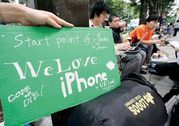 지난해 6월9일, 아이폰이 출시되는 ‘역사적인’ 날 소프트뱅크 앞에서 차례를 기다리는 사람들. REUTERS/ TORU HANAI