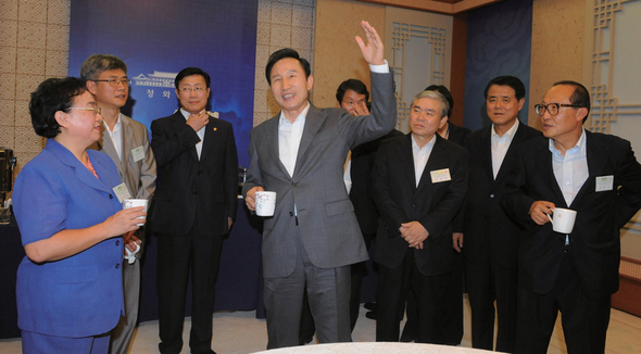 이명박 대통령이 지난해 8월 청와대에서 열린 제3차 국가에너지위원회 회의 전 참석자들과 건물의 에너지 효율에 대해 대화를 하고 있다. 청와대사진기자단