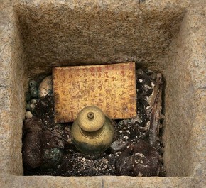 <삼국유사> 오류 논란을 촉발시킨 익산 미륵사 서탑 사리장엄구의 출토 모습. 사리호와 사리봉안기 금판이 보인다. 국립문화재연구소 제공