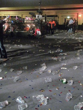 공연이 끝난 뒤 공연장 바닥을 발 디딜 틈 없이 가득 메운 플라스틱 맥주잔