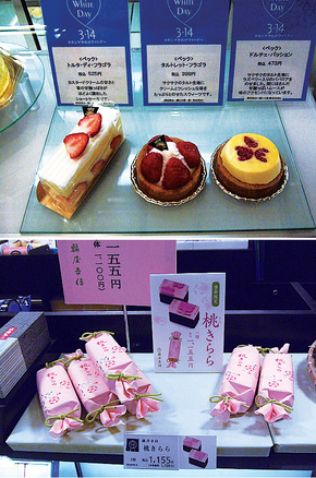 도쿄 니혼바시역의 백화점 다카시마야 지하 1층의 먹을거리들. 펙 밀라노(PECK MILANO)의 계절신상품 딸기케이크(위)와 200년의 역사를 지닌 교토 화과자의 대표 쓰르야요시노부가 4월까지만 파는 계절 한정품 양갱.