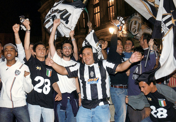 2005년 5월20일 유벤투스가 세리에A 우승컵을 품에 넣자 토리노의 피아자 카스텔로에서 유벤투스 팬들이 환호성을 지르고 있다. 사진 REUTERS
