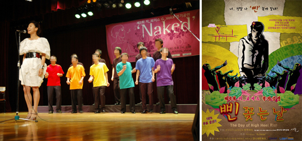 한국게이인권운동단체 친구사이 ‘언니들’이 술자리에서 ‘어린 것들’이 열받게 만들면 소매를 걷어붙이면서 해온 농담이다. 이른바 ‘칠공주’ 언니들이 ‘맞장’ 뜨러 갈 때 거침없는 하이킥을 날리기 좋도록, 거동의 자유를 얻기 위해서 교복 치마 아랫단에 ‘삔’(핀)을 꽂으면서 생겼다는 전설의 관용구는 이렇게 새로운 용례를 얻었다. 게이(남성동성애자)로 살면서 남몰래 심장에 삔을 꽂게 되는 분통 터지는 현실이 없다면, 이 농담은 그토록 통쾌한 ‘메타포’를 얻지는 못했을 것이다. 한동안 수절 아니 수양을 하면서 삔을 허벅지를 찌르는 데만 썼던 언니들이 다시 머리에 삔을 꽂고 나선다. 서울 대학로 동덕여대 공연예술센터 대극장에서 게이 코러스(합창단) ‘지_보이스’(G_Voice) 20명이 단체로 머리에 삔을 꽂고 목소리를 높인다.